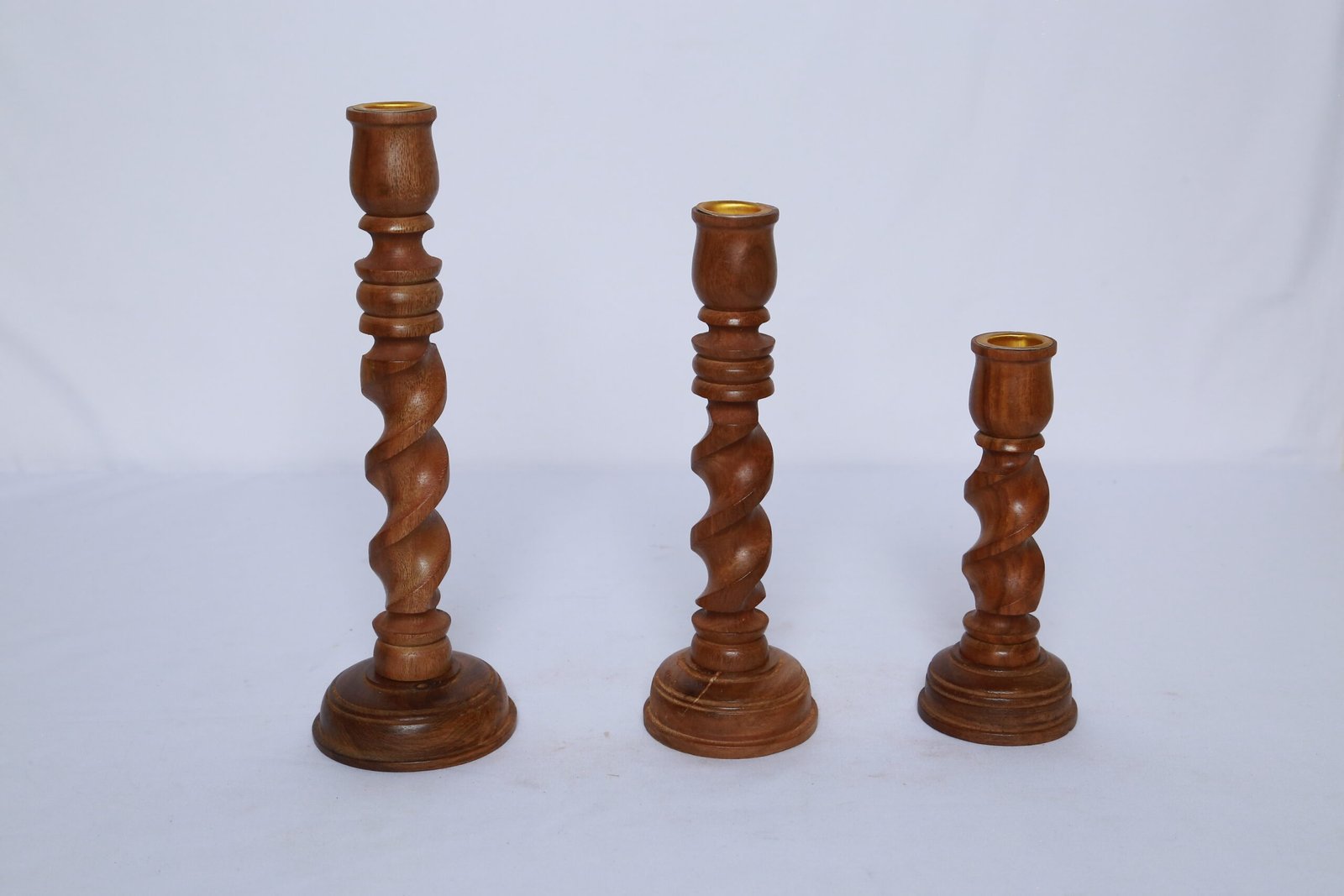 Bring home a touch of natural charm with this exquisite Set of 3 Curved Wooden Candle Stands, each beautifully handcrafted to perfection. Measuring 9.5, 8.0, and 6.0 inches in height, these candle stands display a gentle curve that adds flow and grace to any room setting. Designed using quality wood, the smooth finish and carved detailing reflect the work of skilled artisans. Whether placed on a mantle, dining table, or shelf, they add warmth and rustic elegance to your décor. Suitable for traditional and modern spaces alike, these stands can hold standard-sized candles, casting a soft, inviting glow during special moments or everyday evenings. Key Features: Handcrafted from premium quality wood for a natural and long-lasting finish Set includes 3 different sizes – 9.5", 8.0", and 6.0" for a balanced visual appeal Elegant curved design adds artistic charm to interiors Compatible with standard-sized candles Ideal for gifting or personal décor use Specification : Dimensions (L ): 9.5 inches, 8 inches, 6 inches Weight : 145 gms, 119 gms, 84 gms Material : Wood Package Contents: 1 x Curved Candle Stands (Set of 3) Care Instructions : Clean the product with a soft wipe or cloth. Minor differences are expected in these handmade products.